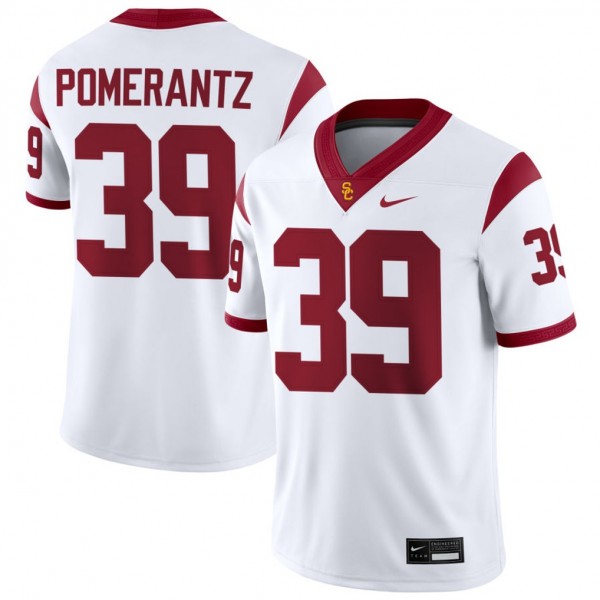• Classic Design: Bold White colorway with embroidered USC logo and Trojans team branding on the chest. Features player name "Pomerantz" and number "#39" on the back, with team logos on the sleeves.