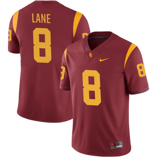 • Classic Design: Bold Cardinal colorway with embroidered USC logo and Trojans team branding on the chest. Features player name "Lane" and number "#8" on the back, with team logos on the sleeves.