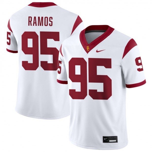 • Classic Design: Bold White colorway with embroidered USC logo and Trojans team branding on the chest. Features player name "Ramos" and number "#95" on the back, with team logos on the sleeves.