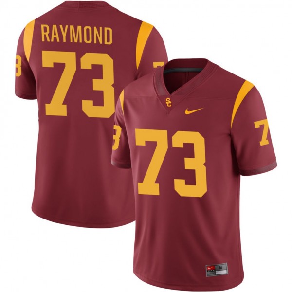 • Classic Design: Bold Cardinal colorway with embroidered USC logo and Trojans team branding on the chest. Features player name "Raymond" and number "#73" on the back, with team logos on the sleeves.