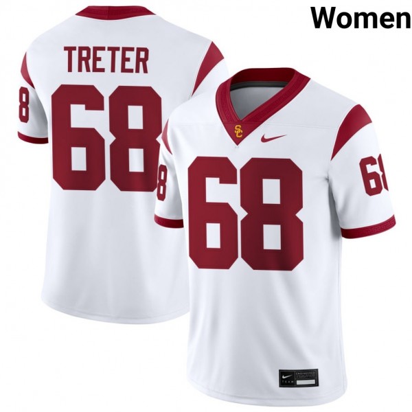 • Classic Design: Bold White colorway with embroidered USC logo and Trojans team branding on the chest. Features player name "Treter" and number "#68" on the back, with team logos on the sleeves.