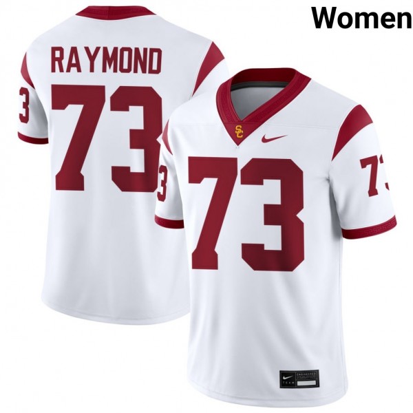• Classic Design: Bold White colorway with embroidered USC logo and Trojans team branding on the chest. Features player name "Raymond" and number "#73" on the back, with team logos on the sleeves.