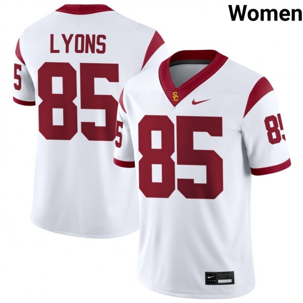 • Classic Design: Bold White colorway with embroidered USC logo and Trojans team branding on the chest. Features player name "Lyons" and number "#85" on the back, with team logos on the sleeves.