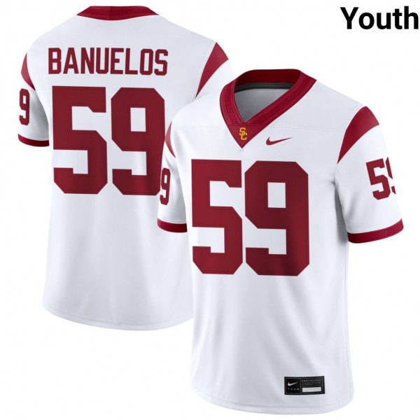 • Classic Design: Bold White colorway with embroidered USC logo and Trojans team branding on the chest. Features player name "Banuelos" and number "#59" on the back, with team logos on the sleeves.