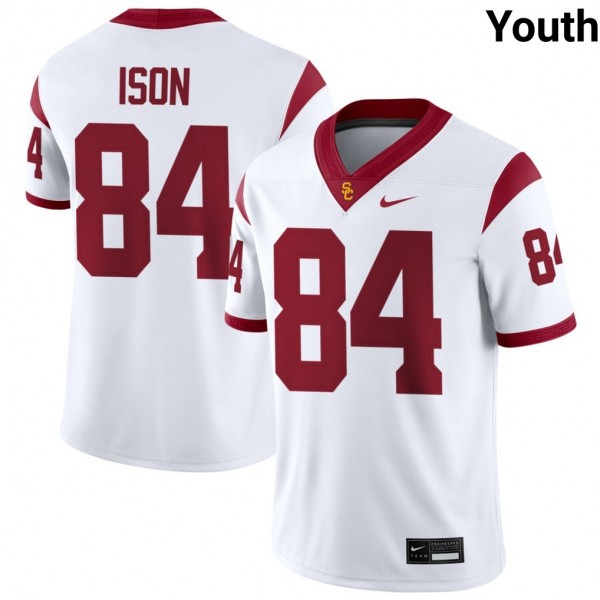 • Classic Design: Bold White colorway with embroidered USC logo and Trojans team branding on the chest. Features player name "Ison" and number "#84" on the back, with team logos on the sleeves.